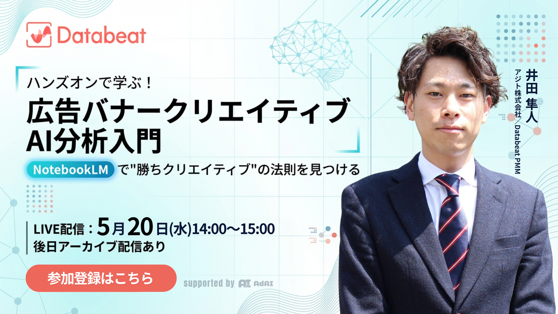 【Databeat】広告バナークリエイティブの"勝ち筋"をAI(NotebookLM)で言語化する実践型ハンズオンウェビナー『広告バナークリエイティブAI分析入門』を5月20日に無料開催